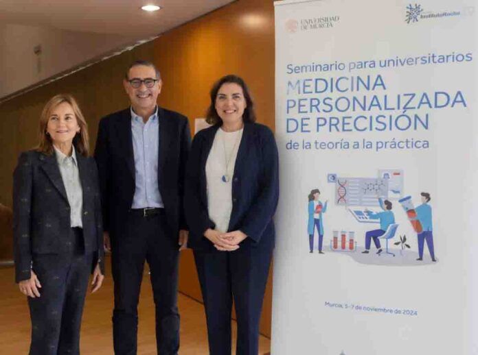 El rector de la Universidad de Murcia, Dr. D. José Luján Alcaraz, ha inaugurado la octava edición del seminario «Medicina Personalizada de Precisión: de la Teoría a la Práctica», coordinado por la Dra. Encarna Guillén, Profesora Titular de la Universidad de Murcia, coordinadora de área del IMIB-Pascual Parrilla y presidenta de la Asociación Española de Genética Humana (AEGH). Organizado por la Fundación Instituto Roche, en colaboración con la Universidad de Murcia, este seminario dirigido a estudiantes universitarios busca acercar los conceptos y avances de la Medicina Personalizada de Precisión a las nuevas generaciones de profesionales sanitarios e investigadores, que jugarán un papel clave en la implementación de esta nueva manera de hacer medicina en el sistema sanitario.